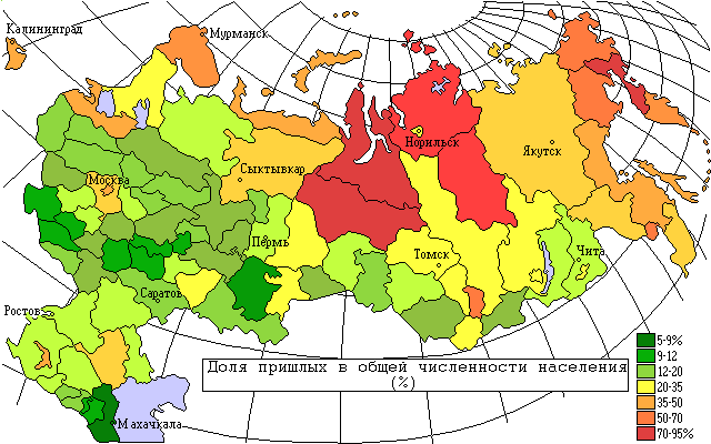 Название: Карта. Доля пришлых (родившихся в другом регионе) в населении (%). Содержание (смысл): Показатель отражает численность деятельно активного населения, способного идти на серьезные изменения в жизни, связанные с переездом на новое место жительства. Материал: Результаты последней переписи населения (1989 г.), при которой учитывался не только регион современного проживания человека, но и регион его рождения. Данные по региона России взяты из работы - Скатерщикова Е. Жизненные миграции россиян, как фактор реальной сплоченности России.// Власть, 1996, № 8. ![]() Метод: Численность населения, рожденного за пределами региона
